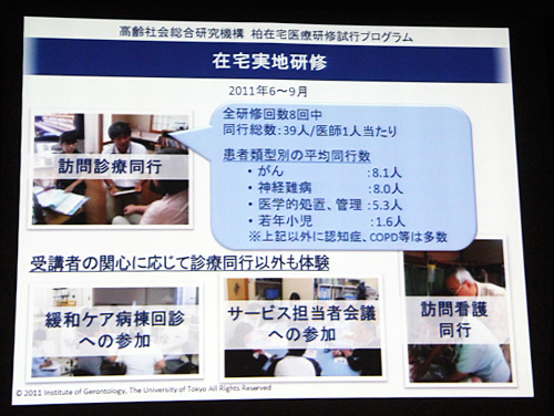 多職種連携の研修には、医師以外にも看護師、薬剤師、ソーシャルワーカー、ケアマネジャーなど文字通り多くの職種の方々が参加し、認知症、栄養・嚥下(えんげ)、褥瘡(じょくそう)、緩和ケアの4つをテーマに講義と演習を行った。また、一般の開業医である受講者が在宅専門医や訪問看護師と一緒になって、訪問診療や訪問看護などを体験する在宅実地研修も実施された。2011年10月には、総括シンポジウムを開催し研修は終了したが、現在も受講者らが参加するワーキンググループが作られ、多職種が連携しやすいシステムの構築を目指して検討が続けられているという。