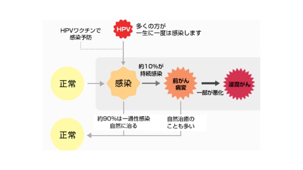 子宮頚がんの原因のほとんどはヒトパピローマウイルス(HPV)というウイルスの感染が原因です。性交経験のある女性の約80%の方が一度はHPVに感染するといわれています。感染してもほとんどの方は無症状のまま免疫の力で自然にHPVが排除されて発症することはありません。HPVが持続感染した一部の方が軽度異形成→中等度異形成→高度異形成→上皮内がん→子宮頚がん(浸潤がん)と進行します。