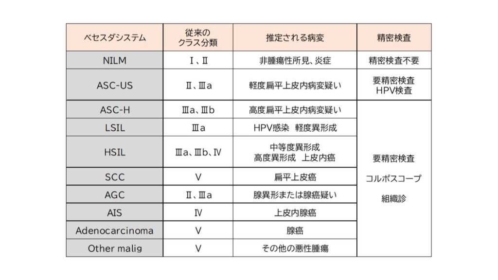 従来、子宮頚がん検診で行われる細胞診の結果はクラス(Class)分類で表されていましたが、細胞の異常の程度をより正確に表しているベセスダシステムという分類が現在使用されています。下記にクラス分類とベセスダシステムの比較を示しました。