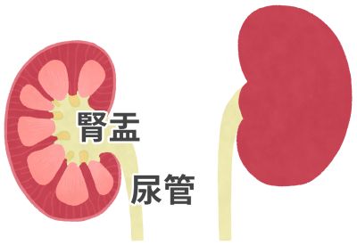 腎臓とは、背中の真ん中あたりに左右一つずつ存在する臓器で、全身の血液を集めて血液中にある老廃物や尿毒症物質を除去し、余分な水分とともに尿を作る働きをしています。腎臓で作られた尿を集めて尿管へ送る部分を腎盂と呼び、その腎臓で細菌が増殖し、炎症が起こることを腎盂腎炎といいます。腎盂腎炎は、腎臓で作られた尿が最初に尿路へ出てくる場所に、細菌による感染が生ずる疾患です。膀胱炎で汚染された感染尿が尿管を逆流して発症する上行性感染と他の感染部位から血液によって細菌が運ばれる血行性感染がありますが、多くの場合は前者のため膀胱炎を同時に合併していることが少なくありません。